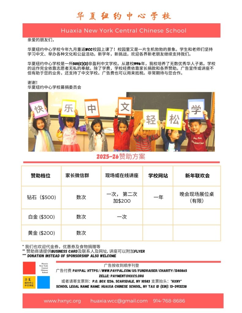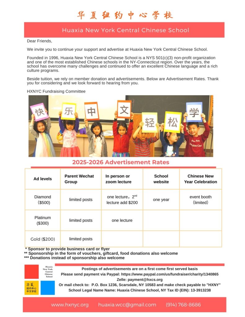Founded in 1996, Huaxia New York Central Chinese School is a NYS 501(c)(3) non-profit organization and one of the most established weekend Chinese schools in the Westchester-CT region. The school is entirely run by volunteers. In addition to tuition, the school relies on member donations and sponsorship for its operation. All sponsorship or donations are tax deductible. Thank you for your support.